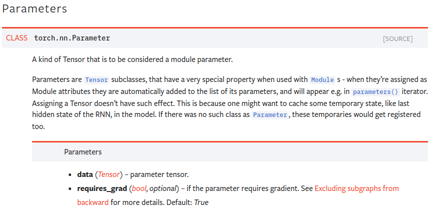 파라메터 오브젝트에 관한 더 자세한 설명 설명은 공식 문서의 torch.nn.Parameter 클래스 부분에 나와있는데, torch.nn.Parameter 클래스는 torch.Tensor 클래스를 상속받아 만들어졌고, torch.nn.Module 클래스의 attribute로 할당하면, 자동으로 파라메터 리스트에 추가되는 것이 기존의 torch.Tensor 클래스와의 차이점이라고 한다.