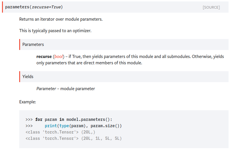 torch.nn.Module.parameters() 공식 문서 Example 부분을 보면 파라메터 오브젝트의 타입이 torch.Tensor인걸 알 수 있다.