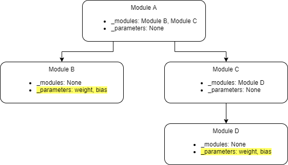 아래의 그림은 모듈의 한 예시인데, 이 경우 A.parameters()를 호출하면, [A.B.weight, A.B.bias, A.C.D.weight, A.C.D.bias]가 반환된다. (물론 recursive=False를 지정하면 직접 A에 속한 파라메터만 반환하는데, 아래 경우에는 아무것도 반환되지 않게된다.)